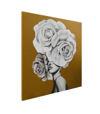 Obraz Kobieta z białymi różami na głowie musztardowe tło o wymiarach 60x60cm. Idealna dekoracja ściany wnętrz w stylu nowoczesnym, glamour, klasycznym czy hamptons.